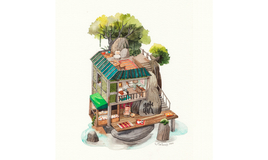 - William Sim, artista di Singapore ispirato a condividere la felicità attraverso le sue opere. Guardate tutte le varianti di case che inventa: in ogni abitazione l’unico elemento che non manca mai è il gatto. Aguzzate la vista!
