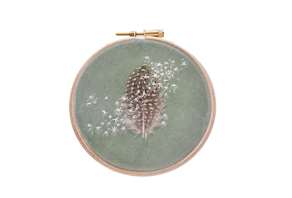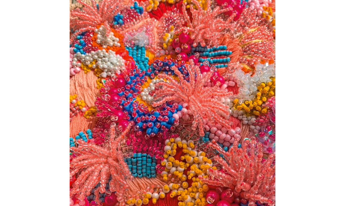 - @milatextiles Mila ricama su porzionidi oggetti, aggiungendo al filo di cotone anche elementi che ricicla, come vecchie perline, creando cromie e pattern naturalistici, direi corallini.