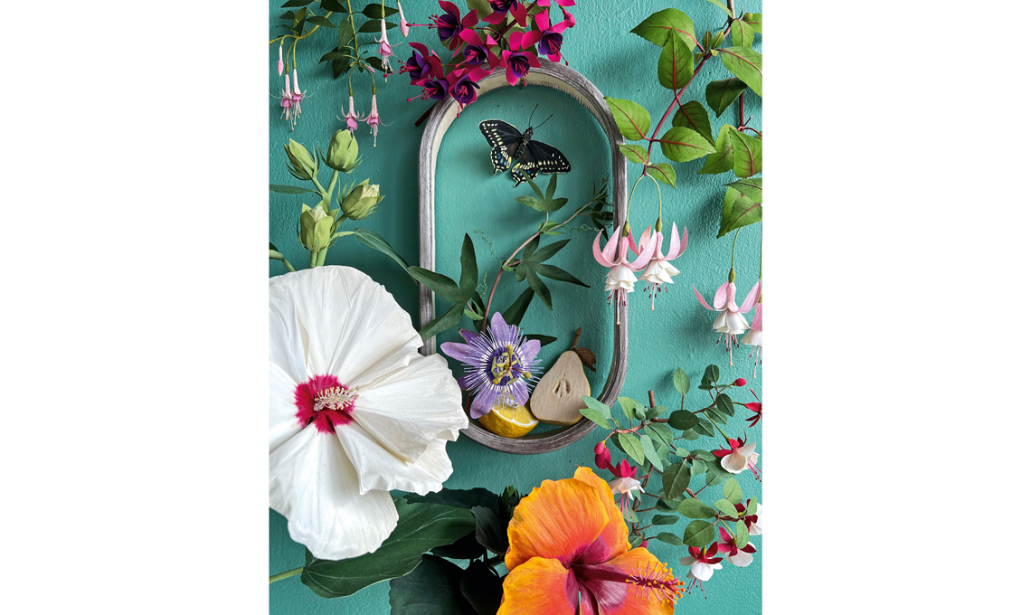 - @woodlucker Ann Wood con la carta allestisce intere pareti di fiori, frutti e insetti. La resa è sorprendente, la cura è minuziosa. Colla, vernice, forbicine e tavole botaniche a cui riferirsi.