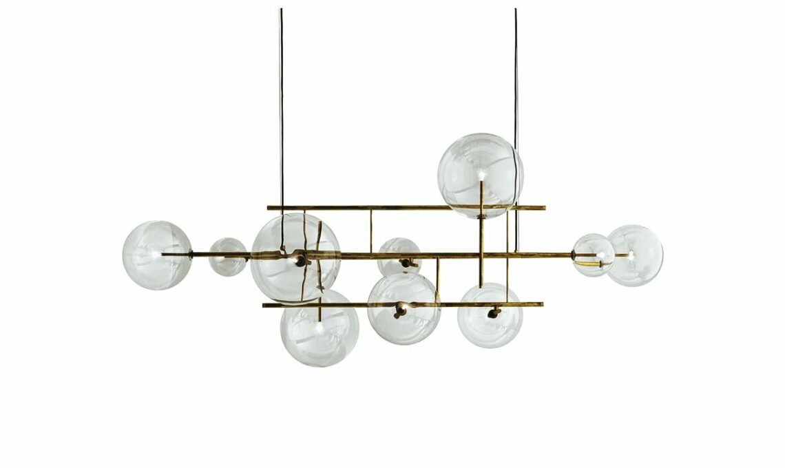 Sfere in cristallo soffiato su una struttura in ottone per il lampadario Bolle Orizzontale di Massimo Castagna [Gallotti&Radice, cm 200x120x85h prezzo su richiesta].