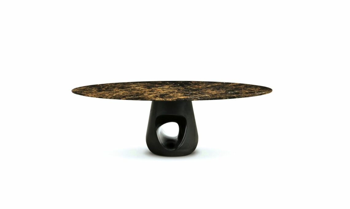Materiali preziosi per il tavolo Barbara di Renato Zamberlan, con piano in marmo e base scultorea in cemento [Horm, cm 240x120x75h €5.200].