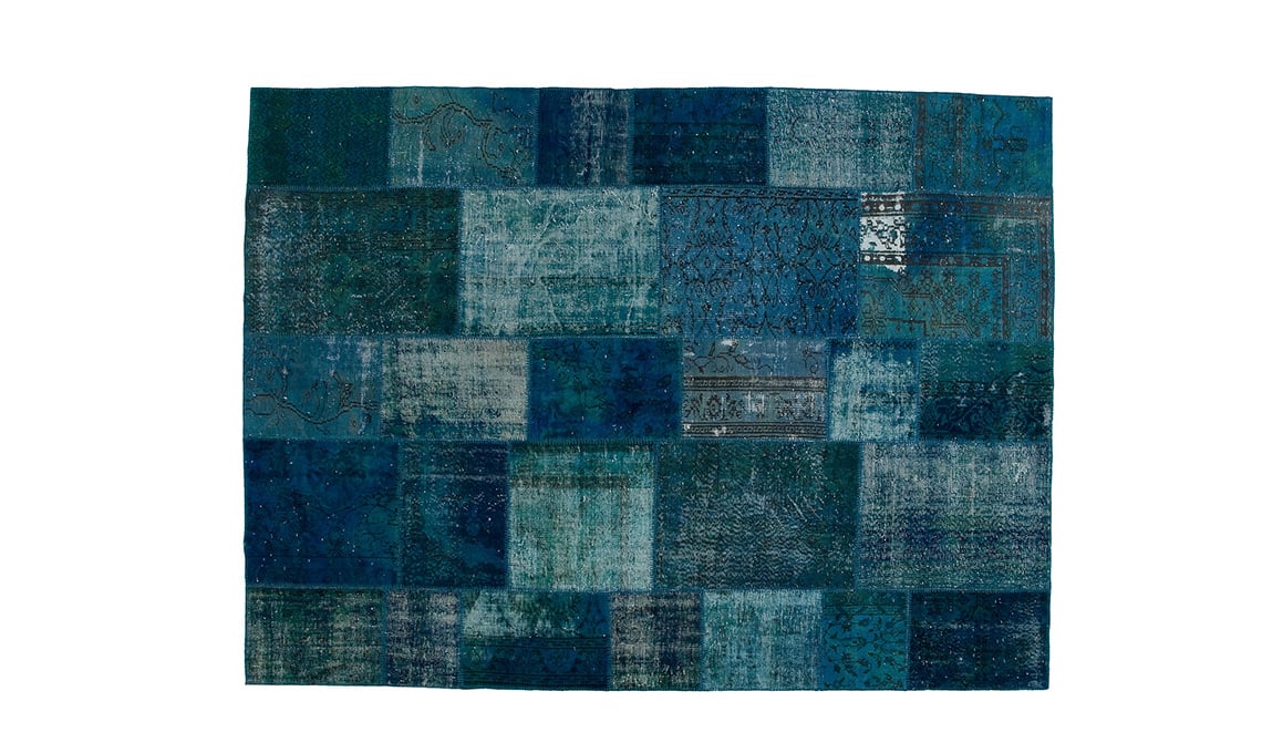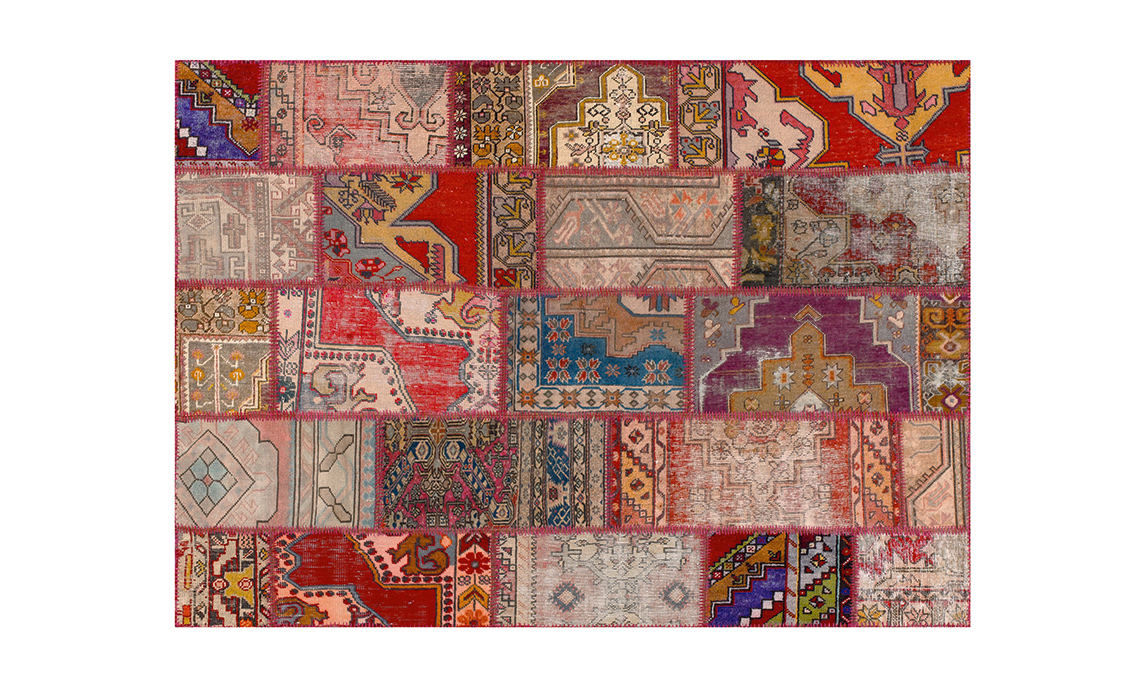 Un pezzo unico ottenuto con la tecnica del patchwork, tagliando e ricucendo a mano antichi tappeti in lana e cotone.