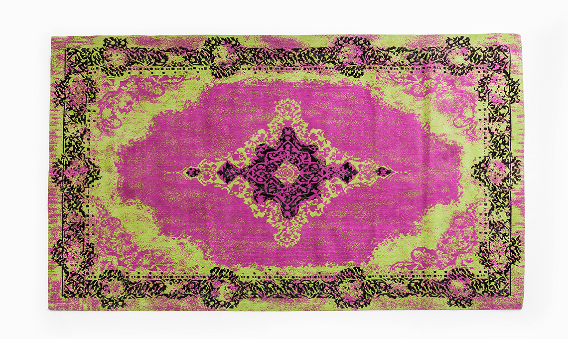 Il tappeto in cotone e poliestere Pop Shock parte dalla tradizione per stravolgerla. La cornice e il motivo centrale sono gli elementi di una volta, mentre i colori sono ‘shock’ [The French Bedroom, cm 240x170 €320].