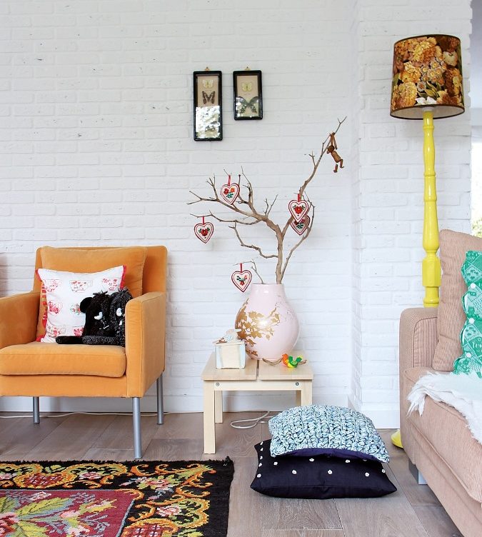 Da copiare subito le ceramiche decorate con semplicità che rendono unica anche la ciotola più anonima e il “mobile” in feltro chiaro: un semplice ramo di ispirazione giapponese i cui fiori sono realizzati con i feltrini che di solito si usano sotto i piedi dei mobili… geniale vero?