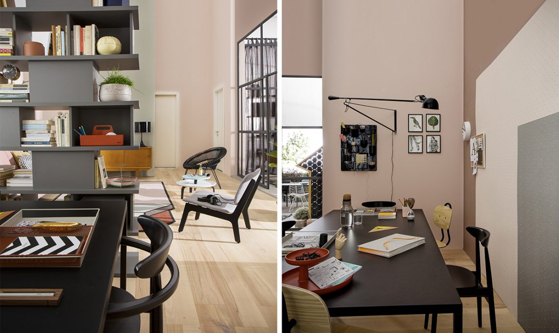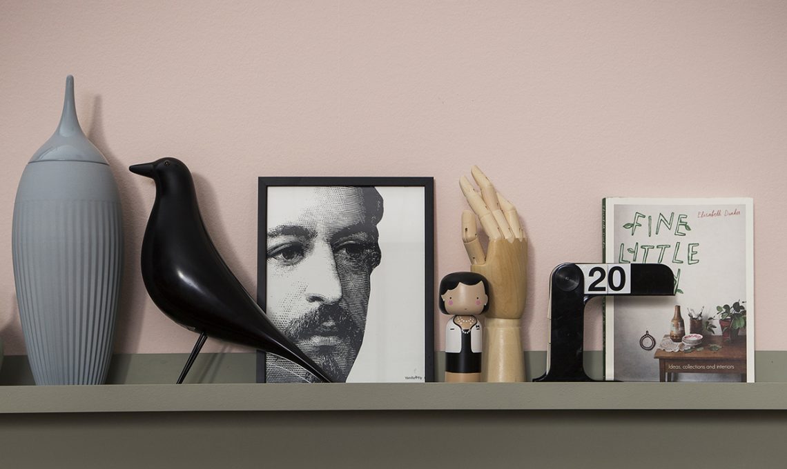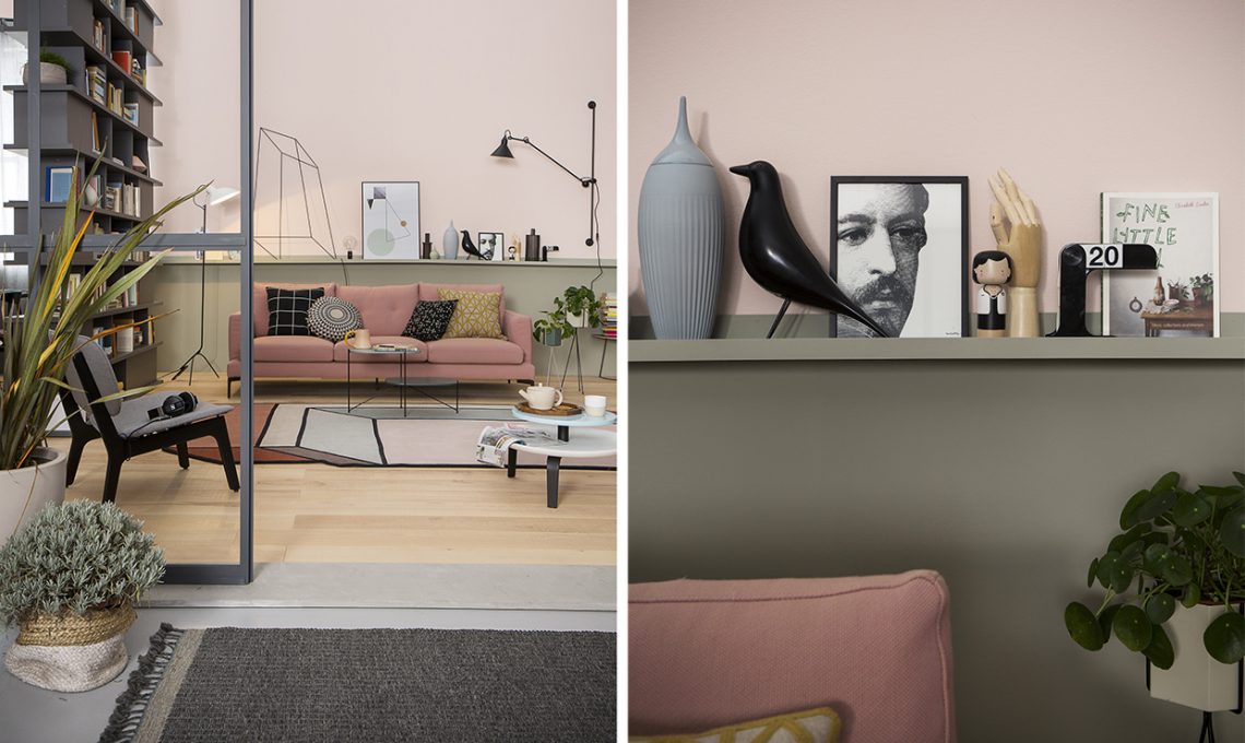 Da copiare Rosa polvere e grigio: due colori, non uno! Così la parete diventa più interessante, anche grazie alla boiserie ottica. Ne segna il confine la mensola lunga e sottile, in legno dipinto come il muro. Sopra, una collezione di ‘cose care’ diventa segno di stile e bacheca dei ricordi.