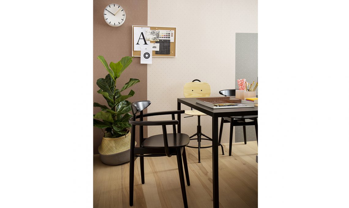 Tavolo Heron [Calligaris, cm 160x90x75h €1.397] con sedie Teo e Teo Ora [Vincent Sheppard da €219 cad] e sgabello Kullaberg [Ikea €69,99]. Tappezzeria Carre [London Art €85,40/mq], orologio [Hay], bacheca [Ikea]. nella pagina successiva: lampada 265 [Flos €790], portaoggetti Uten.Silo II [Vitra €347,70] e stampe [Vanilla Fly].