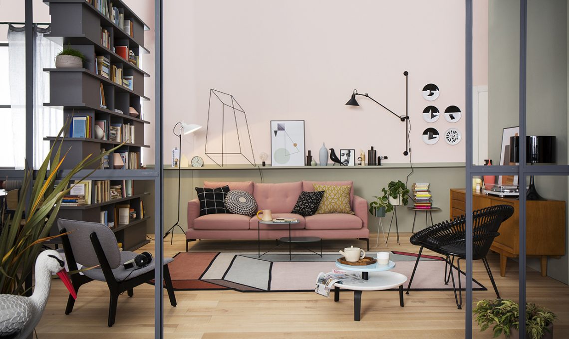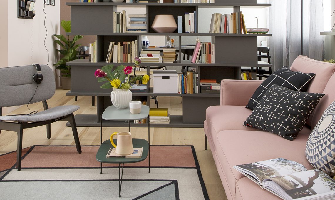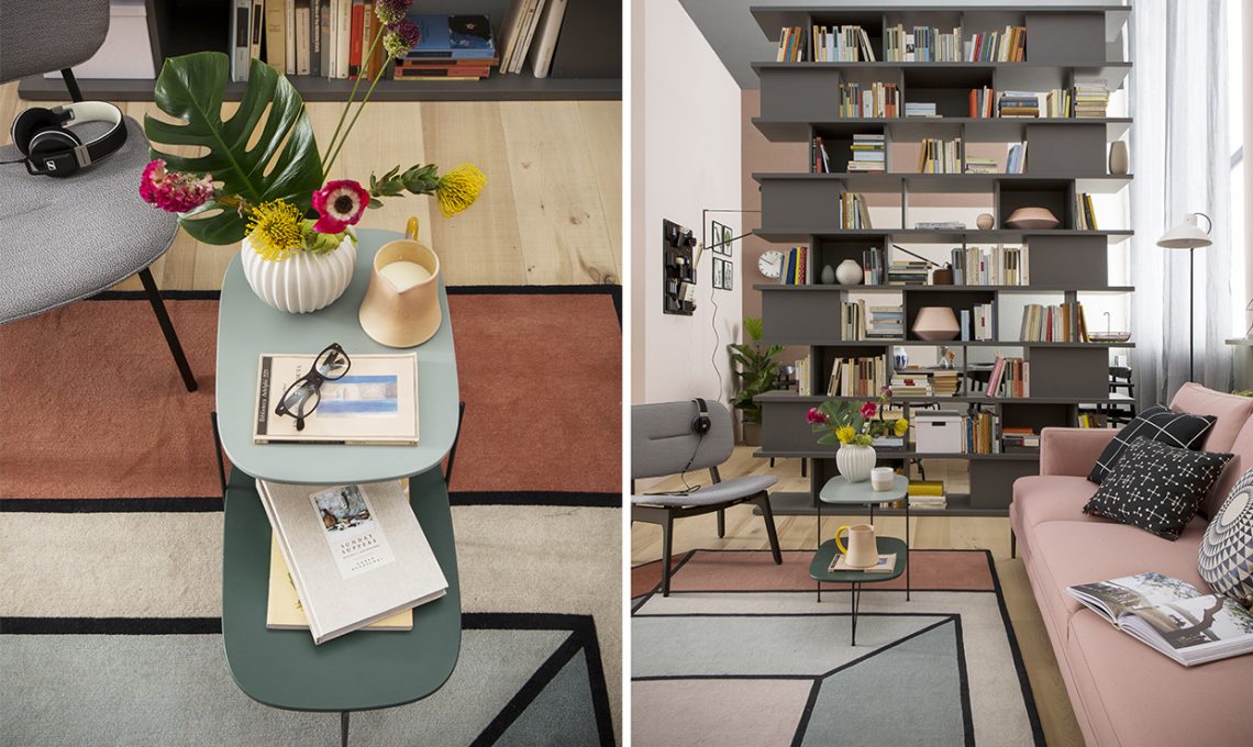 Tavolino Haiku con piani in due nuances di verde [Saba Italia, cm 35x70x41h €427]. Sopra, brocca rosa [Bifranci €40] e vaso Schollert [Lucie Kaas, cm 17h €62].Sul divano Essentiel rosa [Saba Italia, cm 250x95x70h da €2.594], cuscini black&white con tessuti Window [Kirkby Design, cm 132h €89/m], Classic Pillows Maharam [Vitra, cm 43x43 €183] e Concentric Cushion tondo [Niki Jones, Ø cm 50 €120]. Sulla libreria Domino [Euromobil, cm 220x38,8x290,8h €2.391], vasi rosa Trio [Calligaris da €95 cad]. Sulla poltrona Felt 2 [Ligne Roset €718], cuffie [Sennheiser].