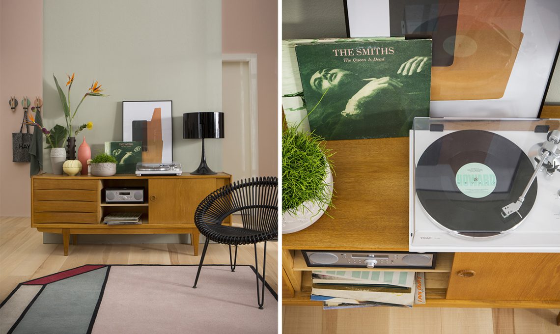 Un tocco vintage: sul sideboard rétro [Lack00 DanishLab, cm 180x50x68h €1.700], vasi: grigi Raw, giallo Dschinni e rosa Alice [Feinedinge da €130], brunito [Bifranci €65]. Bambola [Lucie Kaas], stampa [Ferm Living]. Lampada Spun Light [Flos €770], poltrona Cruz [Vincent Sheppard]. Giradischi a cinghia 33/45 [Teac €399]; sul ripiano sottostante, radio digitale con bluetooth Radio Music System Two [Tivoli Audio €549].