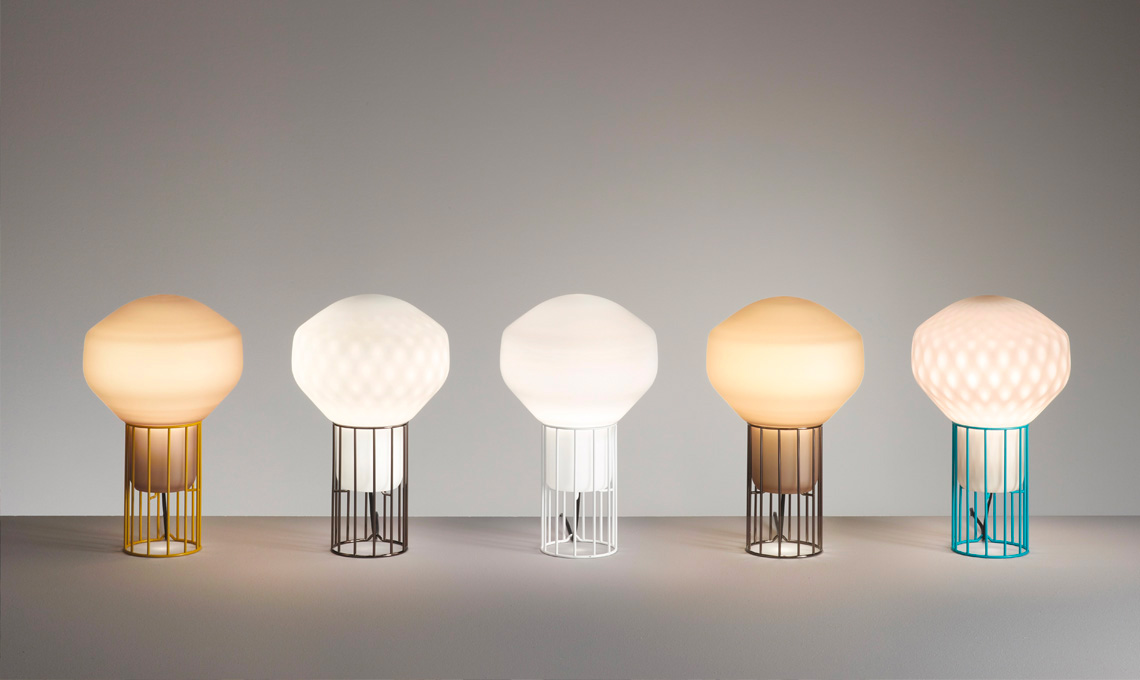 La piccola versione di Aérostat, lampada da tavolo originariamente in vetro soffiato bianco lucido progettata dal designer Guillaume Delvigne per Fabbian si arricchisce oggi con nuove finiture per una limited edition di 50 pezzi per ciascun abbinamento di nuovi vetri e finiture della base: bianco opaco, azzurro opaco, nero galvanica e senape opaco, la base. Fumè incamiciato bianco latte acidato, bianco latte ballotton acidato, bianco latte acidato e tortora incamiciato bianco latte ballotton acidato, il vetro. Il vetro diffusore a seconda della lavorazione genera un effetto di luce differente.