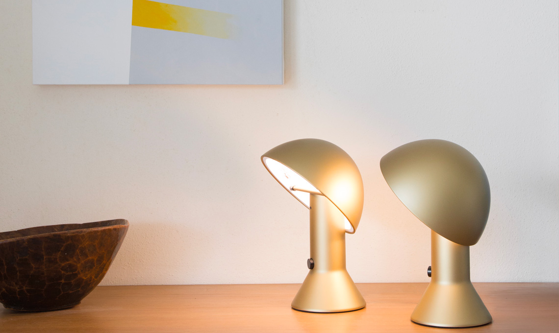E arriviamo a Elmetto, lampada storica dell’azienda Martinelli Luce nella sua nuova finitura oro che si mostra in tutto il suo splendore. Disegnata da Elio Martinelli nel 1976 è un progetto estremamente funzionale: con il suo inconfondibile interruttore di grandi dimensioni, sul corpo centrale, che permette una facile accensione anche al buio e con riflettore orientabile con la semplice pressione di un dito è un classico del design italiano. Davvero una lampada senza tempo.