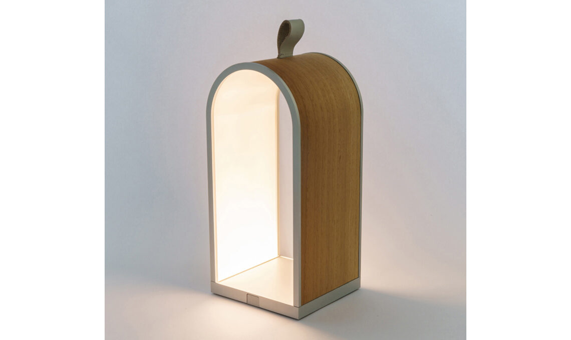 Lampada-espositore Kyta, rivestita in legno o pelle. Dimmerabile, autonomia 6h alla massima potenza. 2,5W [Emera Design, cm 13,5x12,5x28,7h € 299].