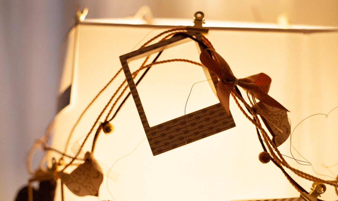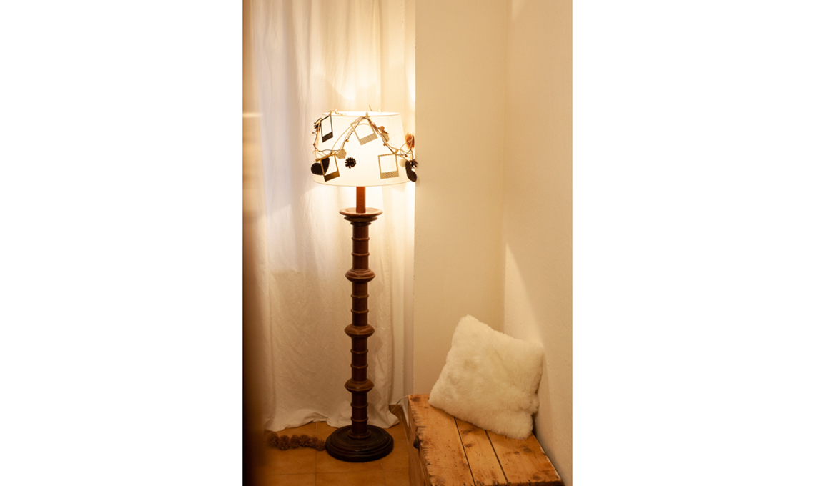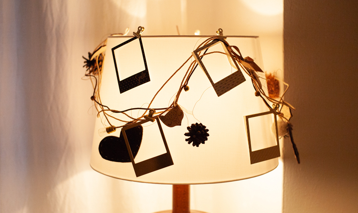 - Noi lo abbiamo trasformato in un porta foto avvolgendolo con dello spago e fissandone le due estremità al paralume. Sullo spago abbiamo poi appeso fotografie e decorazioni speciali