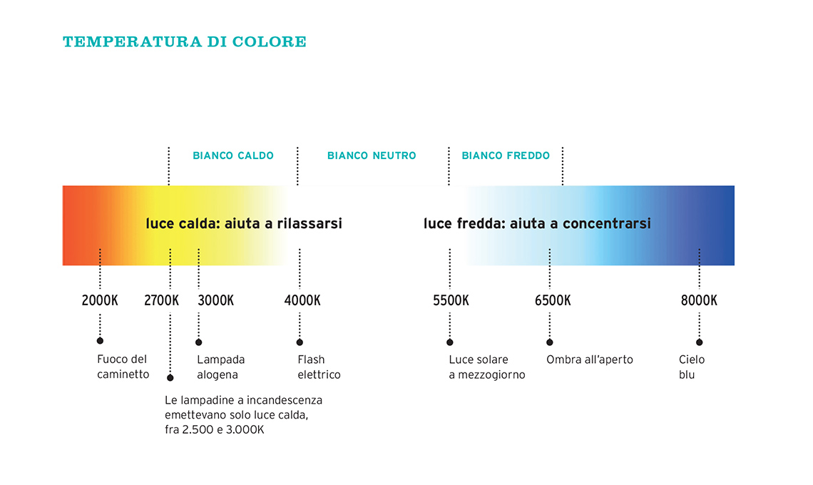 È un parametro essenziale quando si compra una lampadina. Il punto di bianco può modificare drasticamente l’aspetto della stanza e, con esso, anche il nostro umore. L’unità di misura della temperatura di colore sono i gradi Kelvin: a numeri più bassi corrispondono luci più calde. Una luce da 3000K, per esempio, è più rilassante e ideale per la sera, prima di coricarsi, mentre una luce da 5500K è perfetta per concentrarsi e lavorare. Luci neutre vanno bene per il piano di lavoro in cucina, mentre le luci calde illuminano l’intera stanza, quindi sono ideali per i lampadari.