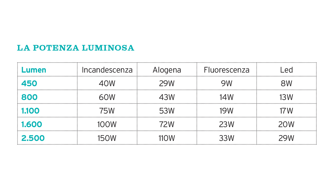 Con le vecchie lampadine a incandescenza abbiamo imparato ad associare i Watt alla luce emessa: sapevamo che per illuminare il soggiorno ci volevano almeno 150W e per la luce da scrivania 50W bastavano. Ma oggi che le vecchie lampadine non esistono più (sono bandite dal 2012), la corrispondenza è venuta a mancare. Occorre quindi usare qualcosa di più scientifico: i lumen. Allora è utile una tabella di conversione (la trovi nella gallery): la lampadina da 60W corrisponde a 800 lumen...