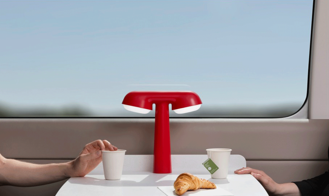 Inizialmente Ionna Vautrin aveva disegnato la lampada da tavolo TGV per la compagnia ferroviaria francese con l’obiettivo di 'tenere compagnia' e far sentire a casa i viaggiatori sui nuovi treni ad alta velocità. La storia ci fa comprendere molto meglio la presenza dei due diffusori di luce speculari. Il risultato è piaciuto così tanto che il brand Moustache ha deciso di permettere alle persone di poterla avere anche a casa, realizzandone una versione domestica, identica nella forma ma differente nelle finiture. E’ una lampada da tavolo a due sorgenti che che dirige la luce diretta verso il basso ed illumina il piano del tavolo.