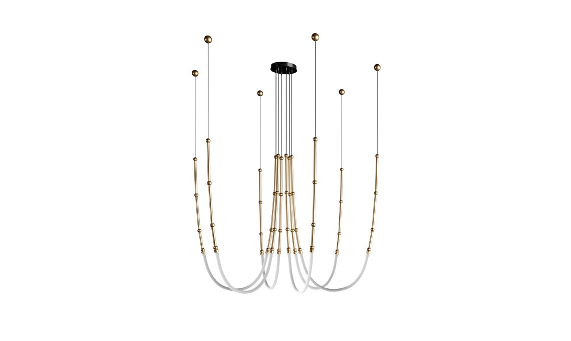 Gli elementi possono essere composti su progetto: per ottenere forme più décor, come qui, oppure minimali. Composto di barre luminose e piccole Sfere, Leda è un sistema modulare [Karman]