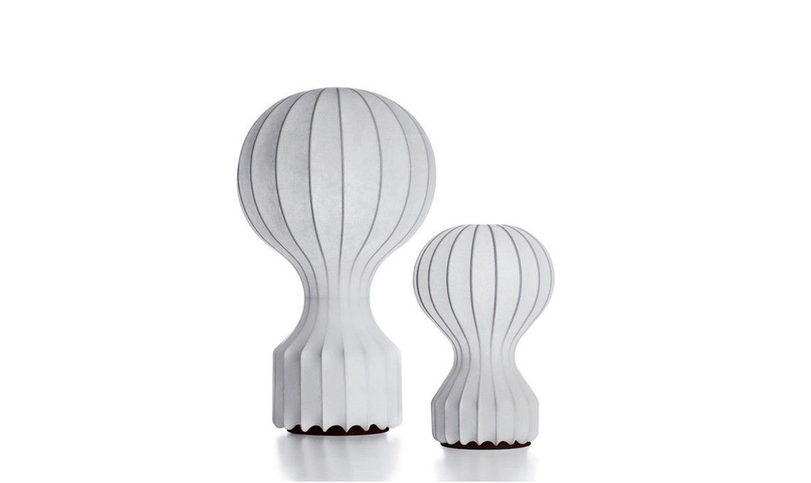 Designer: Achille e Pier Giacomo Castiglioni Produttore: Flos Anno di progettazione: 1960 Ha l'ingombro di un gatto, composta, silenziosa ma capace di fare le fusa... i fratelli Castiglioni sono i designer che più sanno ispirare sentimenti con i loro progetti. Ci si affeziona, fanno compagnia, li si considera compagni di vita, proprio come un gatto! Durante la produzione la struttura metallica interna viene fatta ruotare mentre sottili filamenti di resina Cocoon vengono spruzzati fino ad avvolgerla completamente come in un bozzolo. Erano gli anni in cui si sperimentava questo nuovo materiale e ancora non si sapeva che con il tempo sarebbe ingiallito. Oggi la resina è stata modificata e l'ingiallimento è una caratteristica solo dei pezzi vintage!