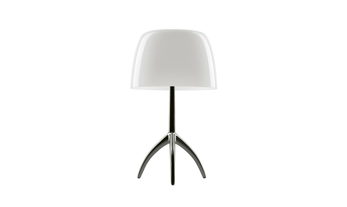 Disegnata per Foscarini da Rodolfo Dordoni, Lumiere dà una rilettura moderna della più classica lampada da tavolo con una finitura lucida per il diffusore in vetro soffiato - erano gli anni in cui Foscarini si apriva dal vetro soffiato all'illuminazione - e il caratteristico treppiede cromato che 'si alza' e slancia l'intera lampada.