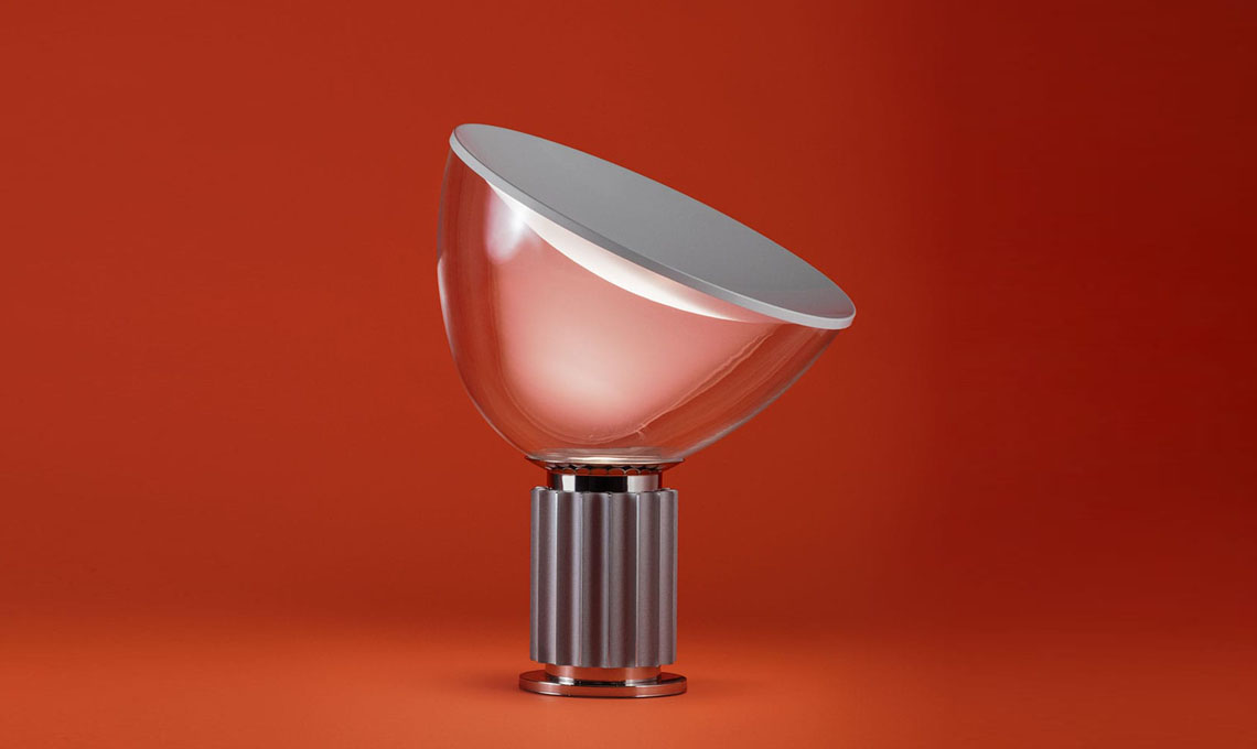 Designer: Achille e Pier Giacomo Castiglioni Produttore: Flos Anno di progettazione: 1958 Taccia è un bellissimo esempio di come l'idea deve confrontarsi con materiali e tecniche. I fratelli Castiglioni avevano scelto materiali plastici, bianco opaco per il riflettore, trasparente per il supporto, ma questa opzione dovette essere presto esclusa a causa delle deformazioni generate dal calore della lampadina a incandescenza. Flos la mise in produzione nel 1962 Flos sostituendo la plastica e utilizzando alluminio per il riflettore e vetro trasparente per il diffusore.