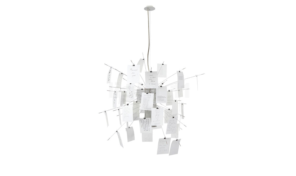 Designer: Ingo Maurer Produttore: Ingo Maurer Anno di progettazione: 1997 Zettel'z è un lampadario iconico che mixa arte, scultura e luce. Viene venduta con fogli di carta giapponese di alta qualità che filtrano la luce e che ognuno può personalizzare con scritte e disegni (40 fogli prestampati e 40 fogli bianchi). La luce alogena è schermata da un bulbo in vetro satinato che protegge la carta dalle alte temperature.