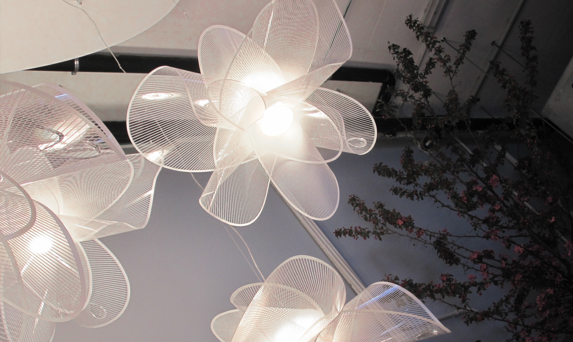 Nella novità La belle ètoile, che dà il benvenuto ai visitatori della casa danzando sospesa sopra l’ingresso , è proprio la qualità di questo foglio sinuoso e decorato con una texture bianca, che illuminato, rende la lampada preziosa e di grande impatto scenografico.