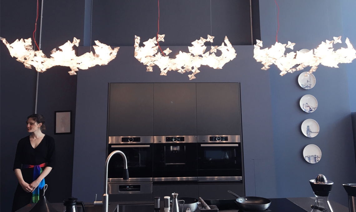 Per non parlare dell’effetto luminoso che dona la plisettatura superficiale nella lampada/origami Hanami installata sopra alla zona cucina.