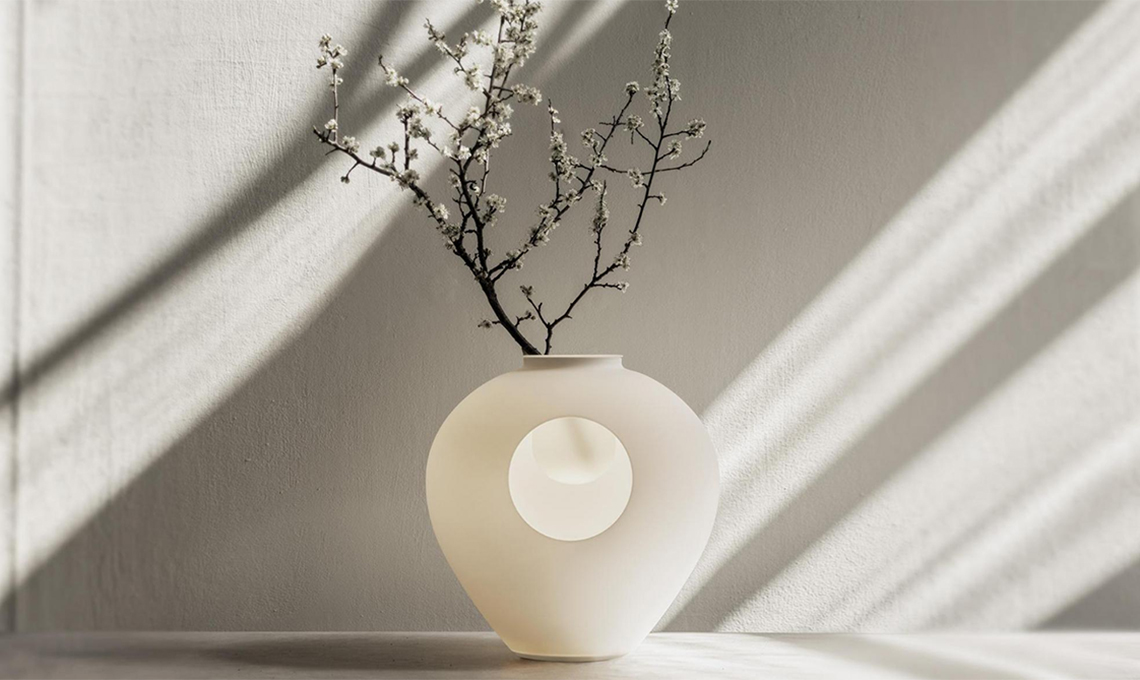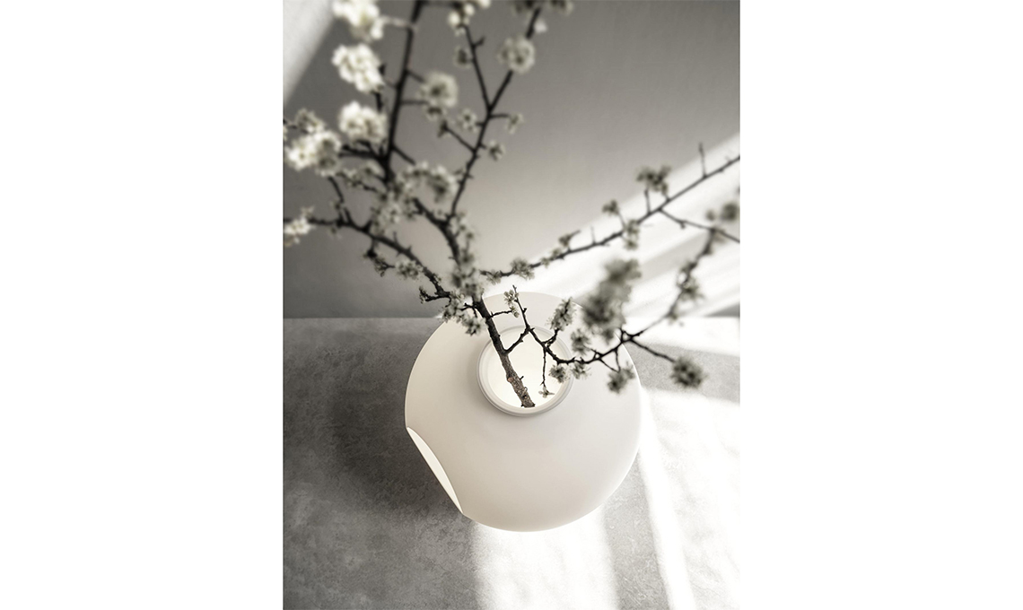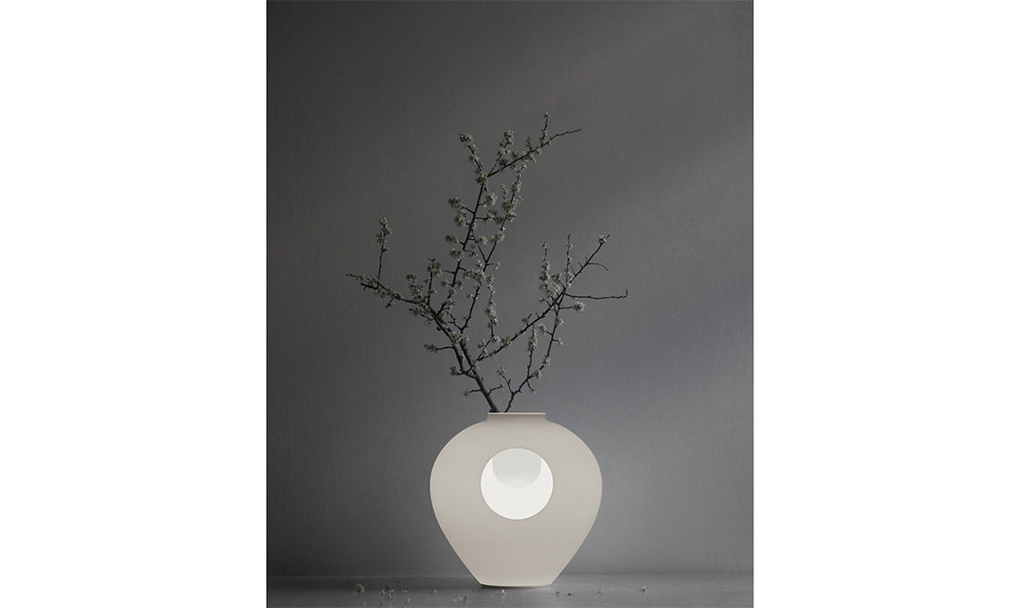 Il contenitore in vetro satinato inserito nell'incavo superiore permette di personalizzarla a piacimento, per esempio, con alcuni rami decorativi. Questo elemento, visibile attraverso il foro frontale, si illumina della luce riflessa proveniente dalla base e offre interessanti effetti luminosi che valorizzano forma e tridimensionalità della lampada.