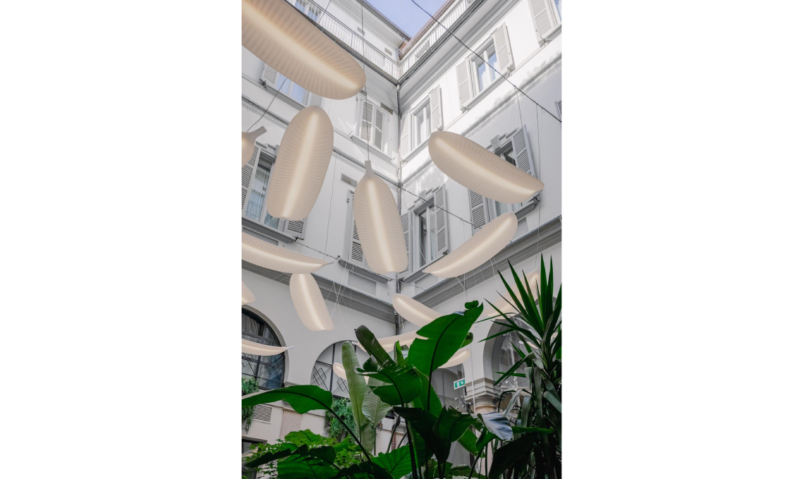 La forma richiama quella delle foglie di banano e, seppur installabile come sospensione singola, è accostandone varie che si ottengono composizioni luminose di grande effetto (è disponibile anche in versione a parete).