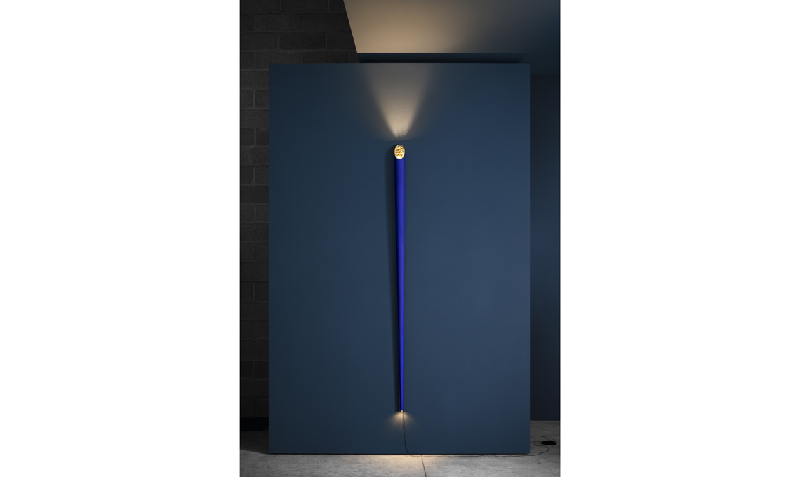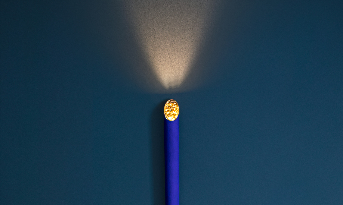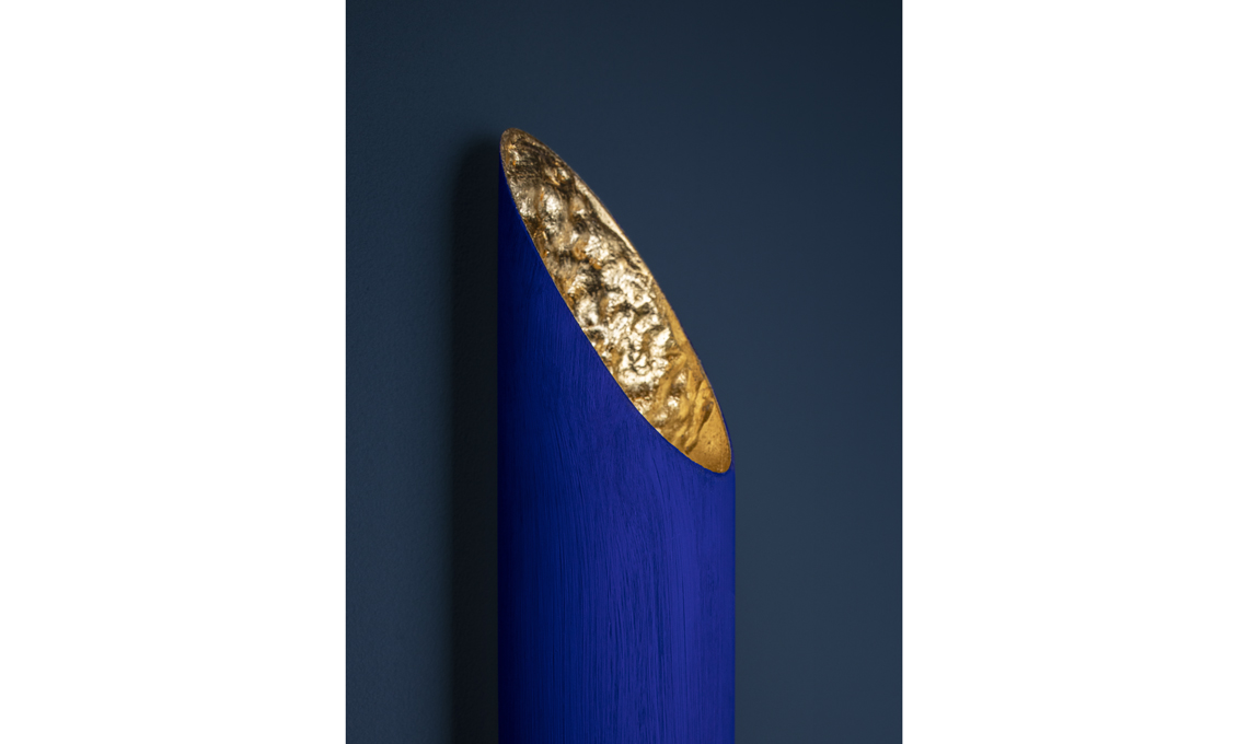 La superficie esterna di Cono W è dipinta a mano di un luminoso blu, a pennellate irregolari, e internamente c’è una riflettente foglia color oro nel caratteristico effetto ‘schiumato’ tipico di Catellani&Smith.
