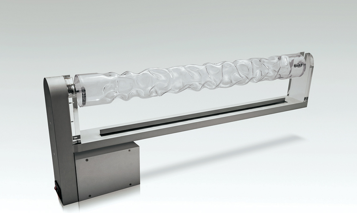 L’effetto è creato da una sorgente lineare Led che si rifrange su un cilindro di vetro borosilicato dalla superficie irregolare realizzato a mano, che ruota lentamente sul suo asse grazie a un silenzioso motore integrato nella struttura che lo sostiene. Al modulo base se ne possono accostare altri quattro.