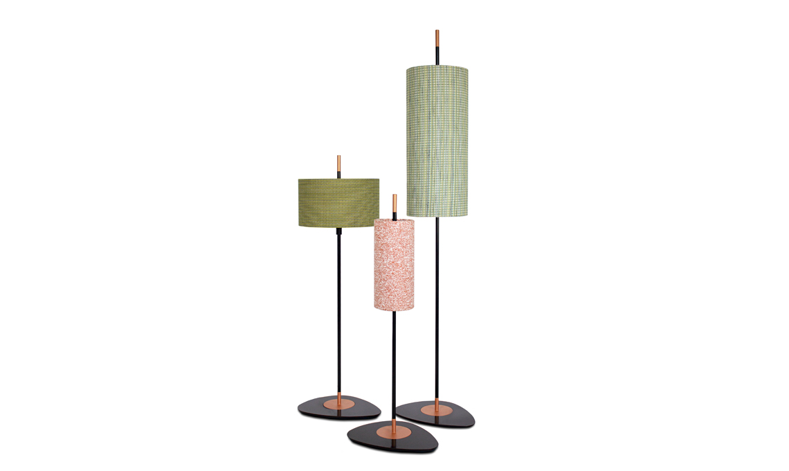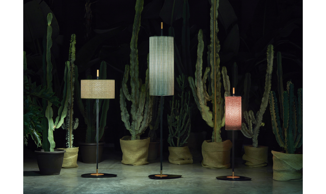 Una luce confortevole filtra attraverso i paralumi rivestiti in tessuto Pierre Frey selezionati in tre eleganti finiture: Noumea Goyave, Bayamo Mimosa e Dominica Caraibes.