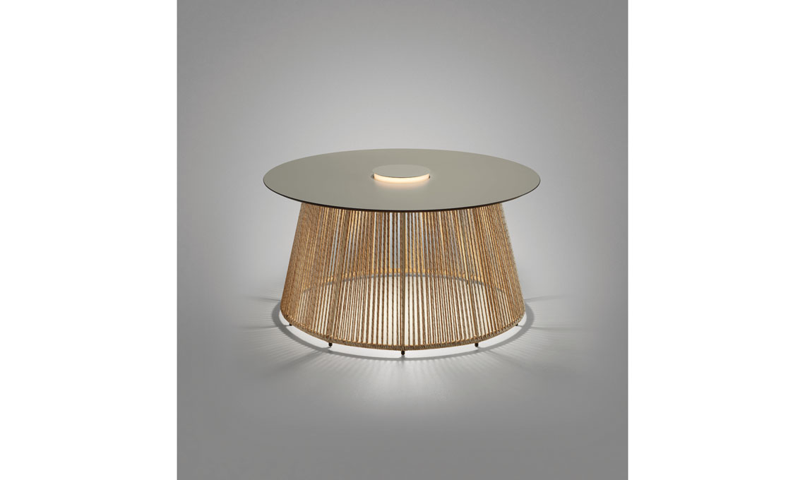 La lampada, infatti, grazie al suo ‘cappello’ superiore si trasforma in comodo tavolino basso. La sorgente, sapientemente posizionata tra il piano e la parte inferiore, fa sì che la luce nella parte bassa sia filtrata dalla trama della corda tesa, per creare un’affascinante bagliore radiale a terra, e nella parte alta illumini in maniera confortevole e non abbagliante il piano e gli oggetti che su di esso sono posizionati. Discreta eleganza...