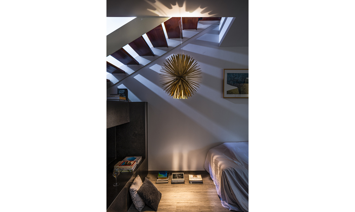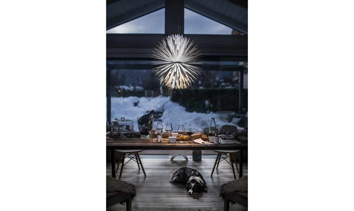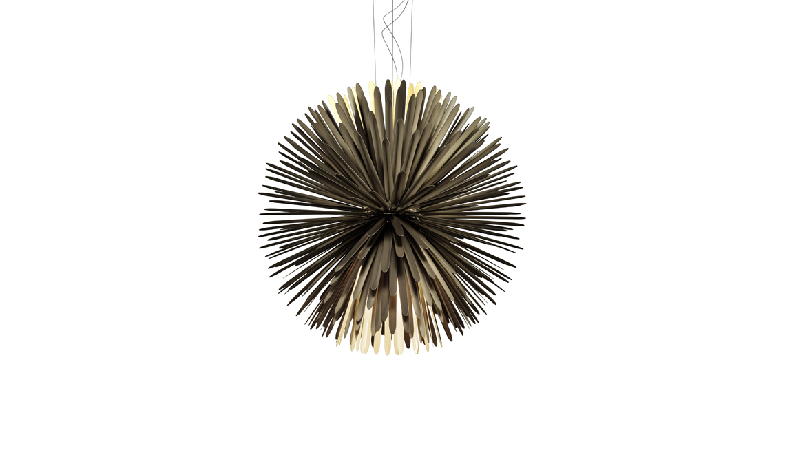 Una sospensione leggera e scenografica, una sfera realizzata con quasi quattrocento raggi d'acciaio, che produce una luce diretta e indiretta al tempo stesso.
