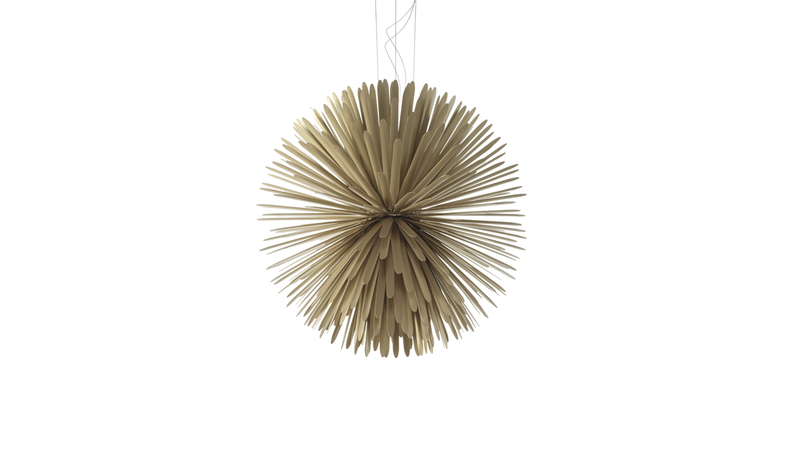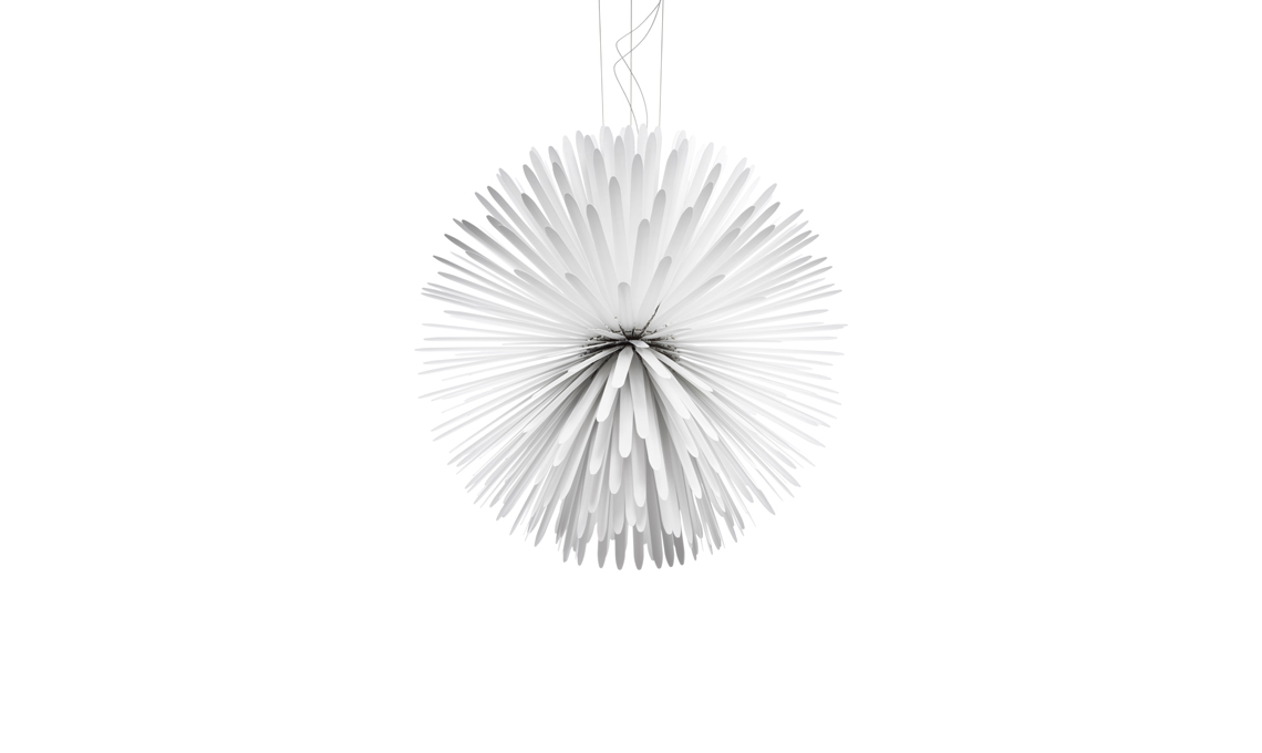 Questa sospensione disegnata da Tord Boontje dall’aspetto leggero e dal grande impatto scenografico è il risultato di 390 raggi in acciaio verniciato che nel loro insieme vanno a creare una forma riconducibile a quella di una sfera.