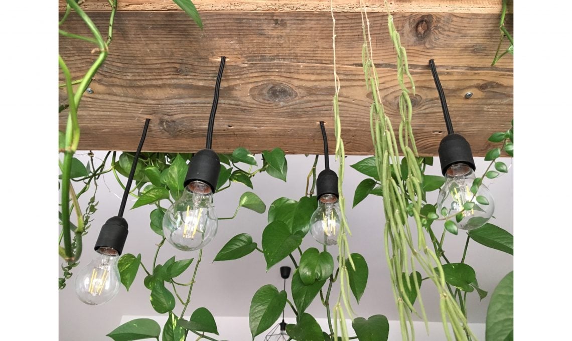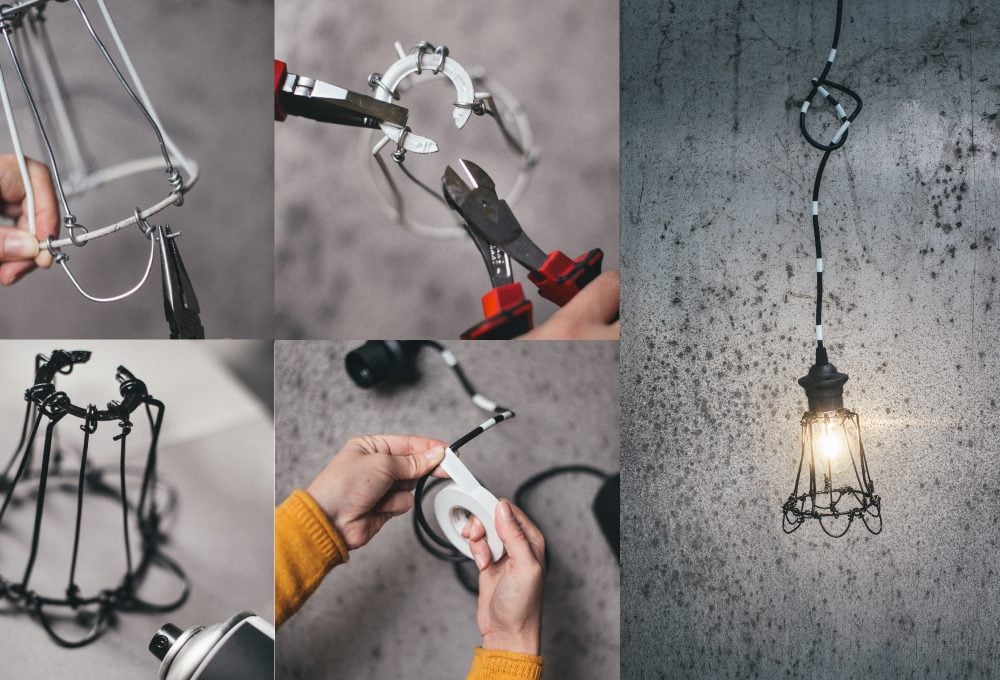 - ‘Moltiplica’ il cavo elettrico con un morsetto e fai scendere i cavi dai fori, agganciando sotto i portalampada.