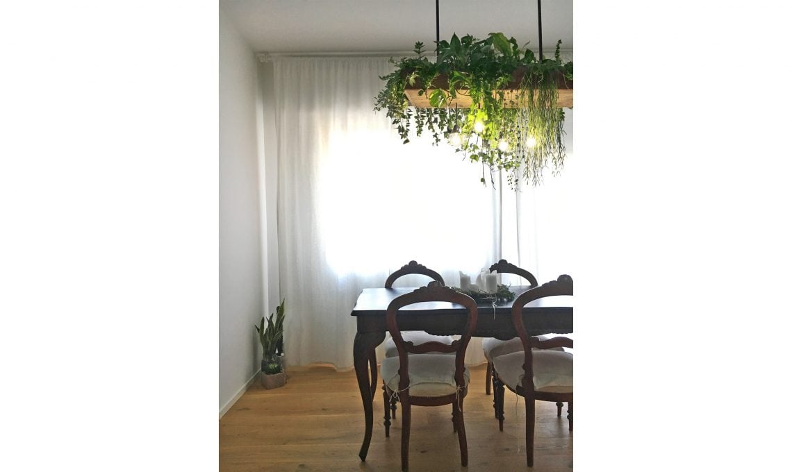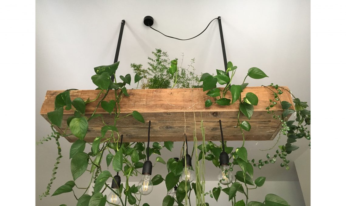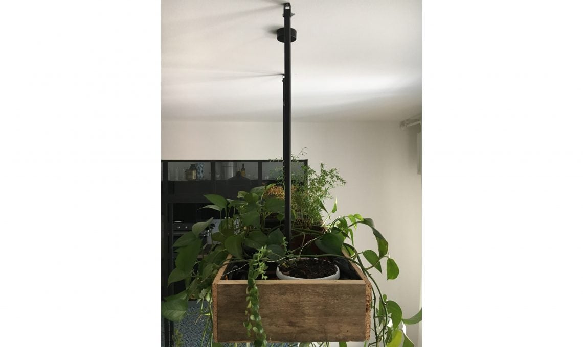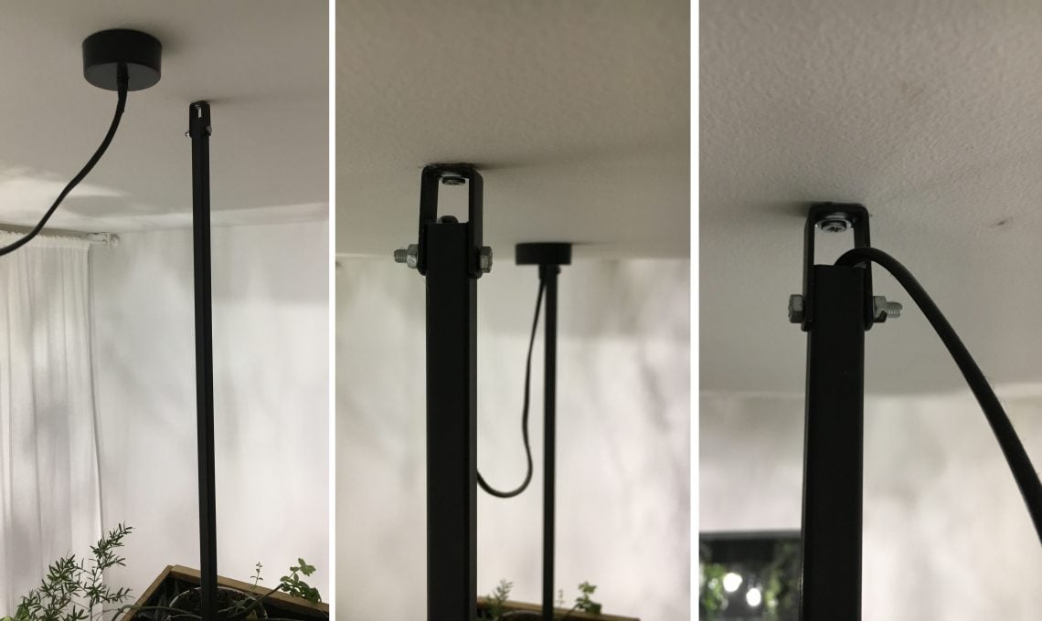 - Stacca la corrente e fai passare il cavo elettrico che scende dal soffitto all’interno di uno dei profili, quindi appendi la fioriera.