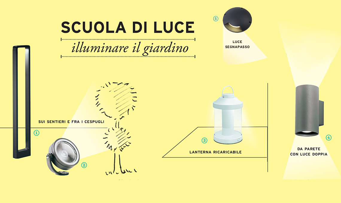La regola base per l’illuminazione del giardino si potrebbe riassumere in questa massima quasi banale. Piante, tavoli, pareti, poltrone, colonne, alberi, sdraio... fai luce sugli aspetti naturalistici e sugli arredi più belli. Prima di definire i punti luce prendi un faretto con una prolunga o una torcia potente e dirigila sulle parti da illuminare per sperimentare l’effetto finale.
