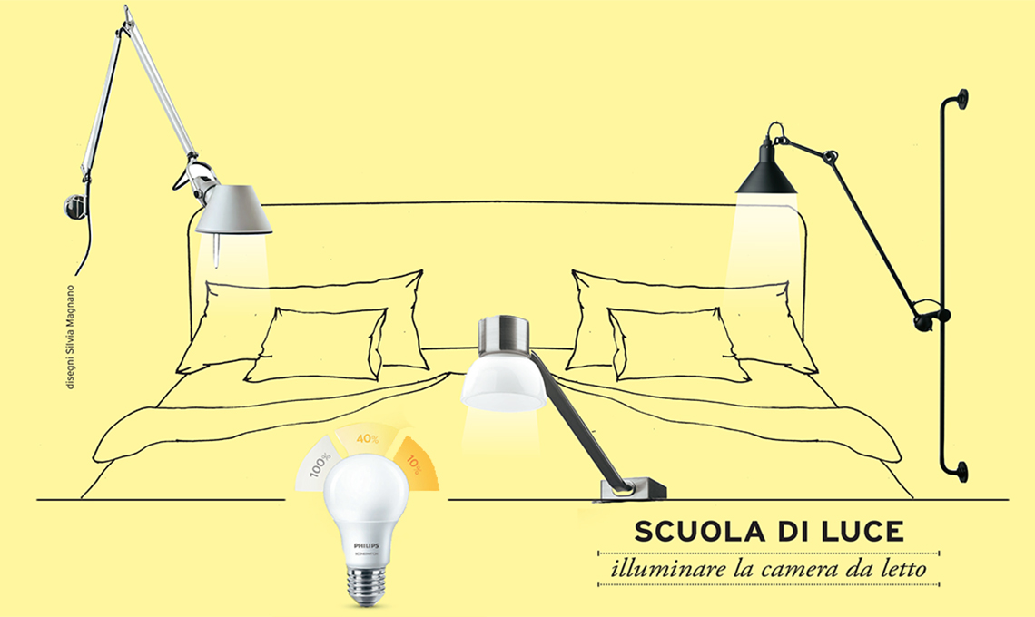 Da sinistra: lampada da parete Tolomeo Mini, dotata di due bracci snodati [Artemide, ø cm 15x111h max da € 182], faretto Led Lindshult, da montare sopra librerie, armadi e pensili per illuminarne il contenuto [Ikea, cm 7,4x34,5x11h € 25], lampe Gras è la lampada con saliscendi e braccio snodato, da fissare a parete [DCW éditions, cm 21x73+20x118h max € 500]. Lampadina SceneSwitch con 3 temperature di calore [Philips, da 8 a 60 W E27 € 12,90].