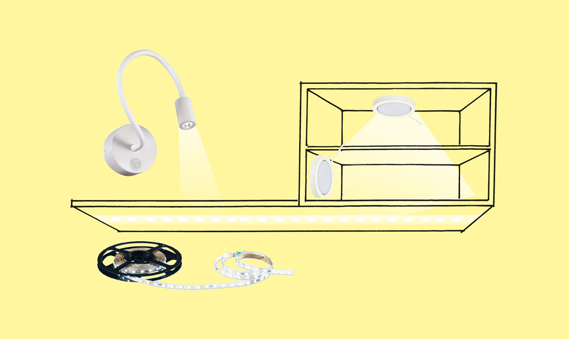 I pensili e le credenze per le stoviglie possono risultare bui a causa della loro profondità o per l’ombra causata dall’anta. Il problema si risolve illuminando i pensili dall’interno con piccoli faretti adesivi. La stessa soluzione è perfetta per valorizzare il contenuto in una credenza a vetrina.