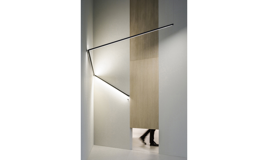 Le sue linee luminose, grazie agli speciali raccordi, sono capaci di connettere due pareti, una parete al soffitto o il soffitto a un punto sospeso, partendo da un unico collegamento elettrico. Ne risulta una scultura leggera nella quale ogni segmento ruota sul proprio asse, dando la pos- sibilità di scegliere dove direzionare la luce. Un sistema, infinite configurazioni.
