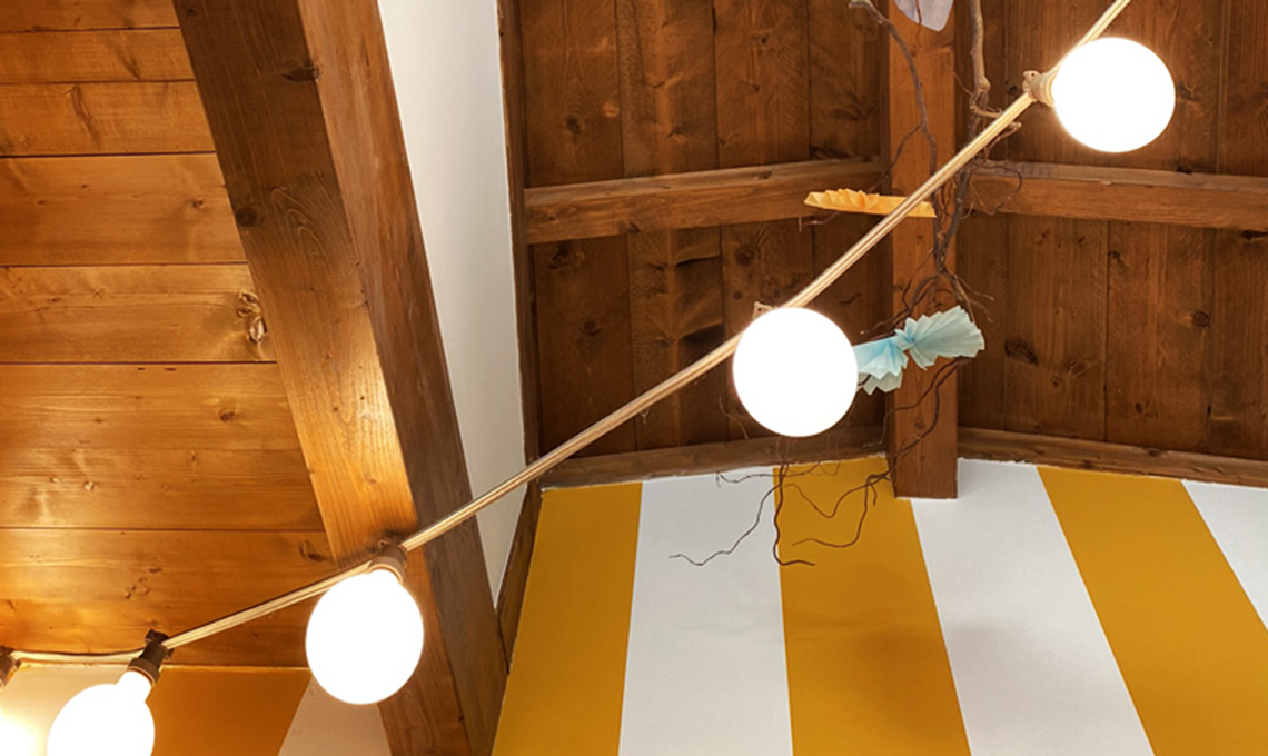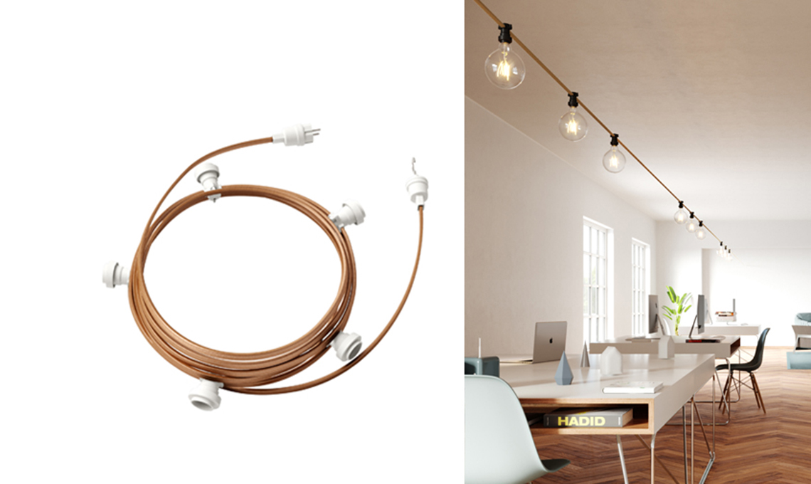Sistema Catenarie di Creative-Cables. La prima soluzione è il risultato di un mio recente progetto di illuminazione per una cameretta per bambini. Tutti i materiali utilizzati per la realizzazione sono assemblati in loco e per l’installazione non è necessaria l’assistenza da parte di un elettricista. Questo sistema componibile delle catenarie da esterno è molto flessibile e permette di realizzare facilmente modelli esteticamente accattivanti che ben si inseriscono in un interno. Ho scelto di utilizzare un cavo rivestito in tessuto color oro tra la vastissima gamma di colori disponibili, e di installare delle lampade opaline globo a LED per una diffusione omogenea della luce.