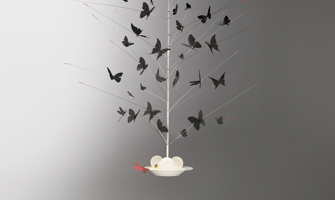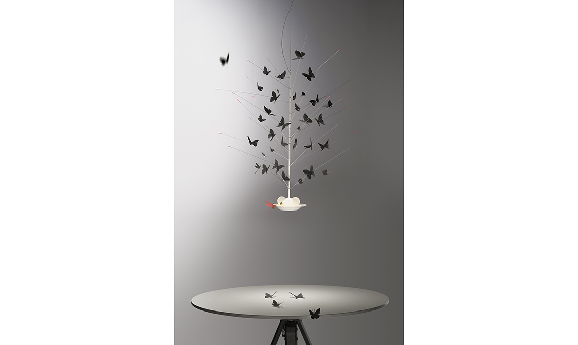 ‘La Festa delle Farfalle’ è composta da 34 farfalle (bianche) e una libellula (verde) di cartoncino tagliate a laser, posate sui rami di un esile fusto in un piatto di porcellana. Nel piatto poggiano, come frutta, tre lampadine non alimentate.