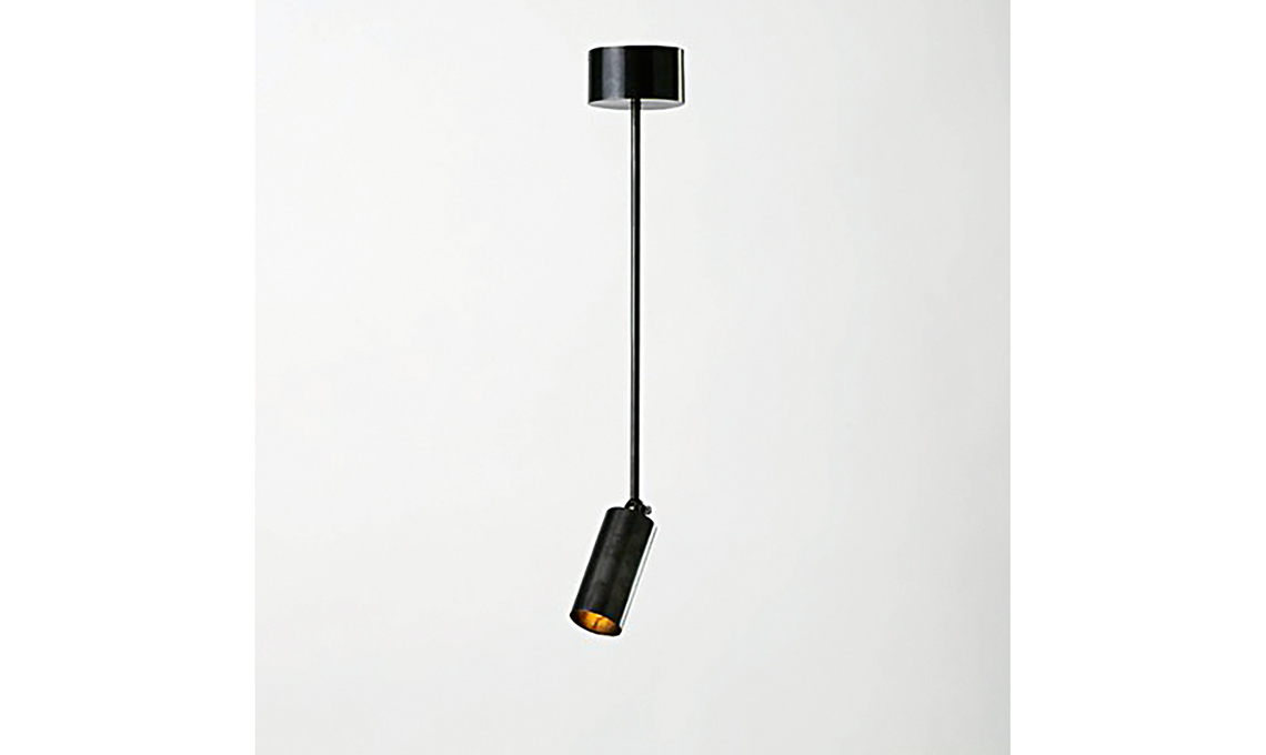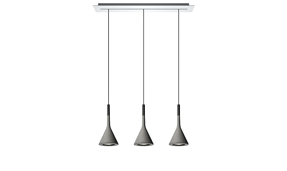 Gli elementi cilindrici in alluminio e policarbonato di Tubes 3 ruotano, per fare luce dove serve (di Nemo). Materiali a contrasto nel paralume di Slope di Miniforms, in legno massello e bronzo. Mood industriale per Aplomb a 3 luci, in cemento e metallo di Foscarini.