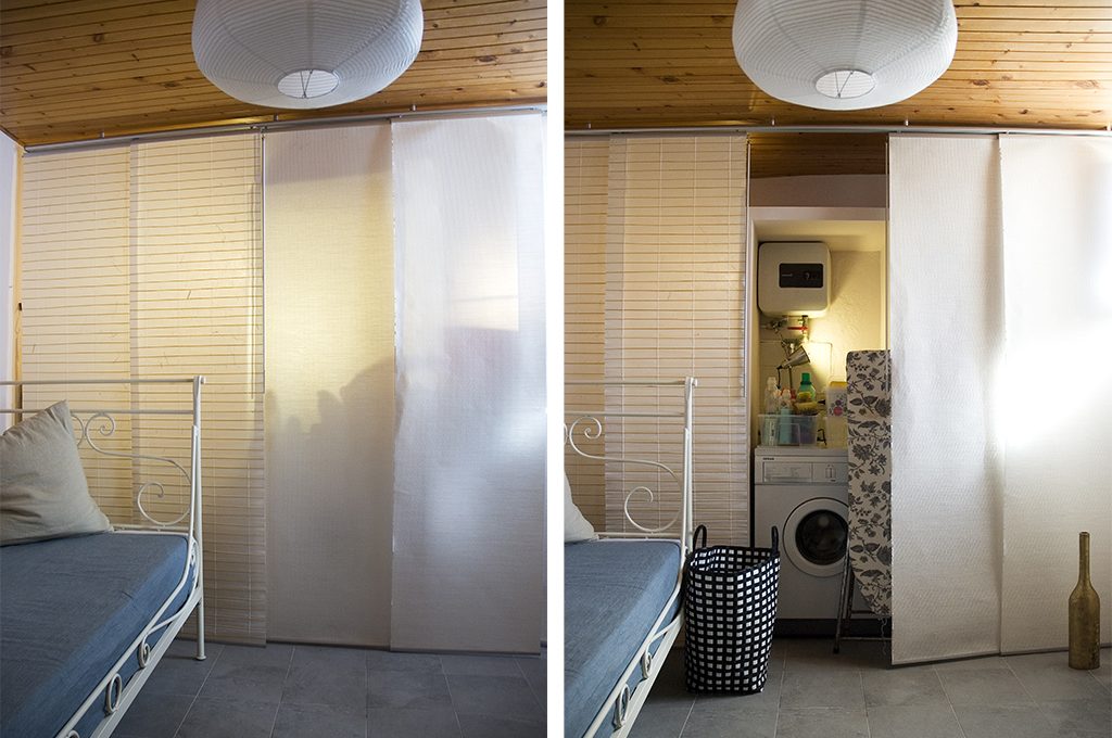 Con una tenda a pannello scorrevole [Ikea] l'angolo lavanderia scompare, ma resta facile e pratico da utilizzare