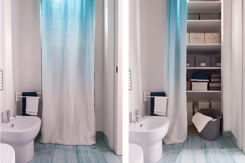 La tenda nasconde lo storage del piccolo bagno: un'idea funzionale e bellissima!