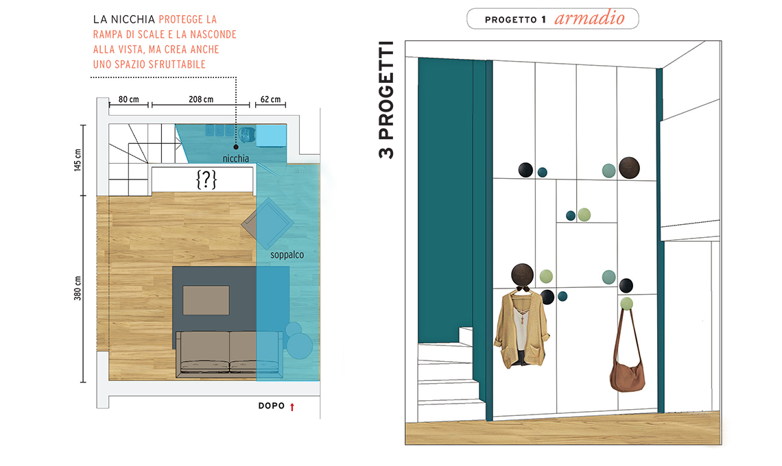 Ad Andrea non piaceva che la scala di accesso alla zona notte fosse completamente a vista: per questo è stata realizzata una nicchia affacciata sul living. La nicchia protegge la rampa di scale e la nasconde, ma crea anche uno spazio sfruttabile. Accanto alla nicchia si apre una porta che dà accesso alla zona sottoscala e qui, dietro la nicchia, c’è ulteriore spazio per ciò che non si vuole tenere in vista.