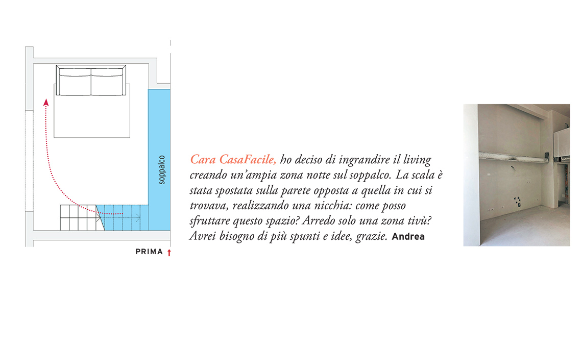 Cara CasaFacile, ho deciso di ingrandire il living creando un’ampia zona notte sul soppalco. La scala è stata spostata sulla parete opposta a quella in cui si trovava, realizzando una nicchia: come posso sfruttare questo spazio? Arredo solo una zona tivù? Avrei bisogno di più spunti e idee, grazie. Andrea