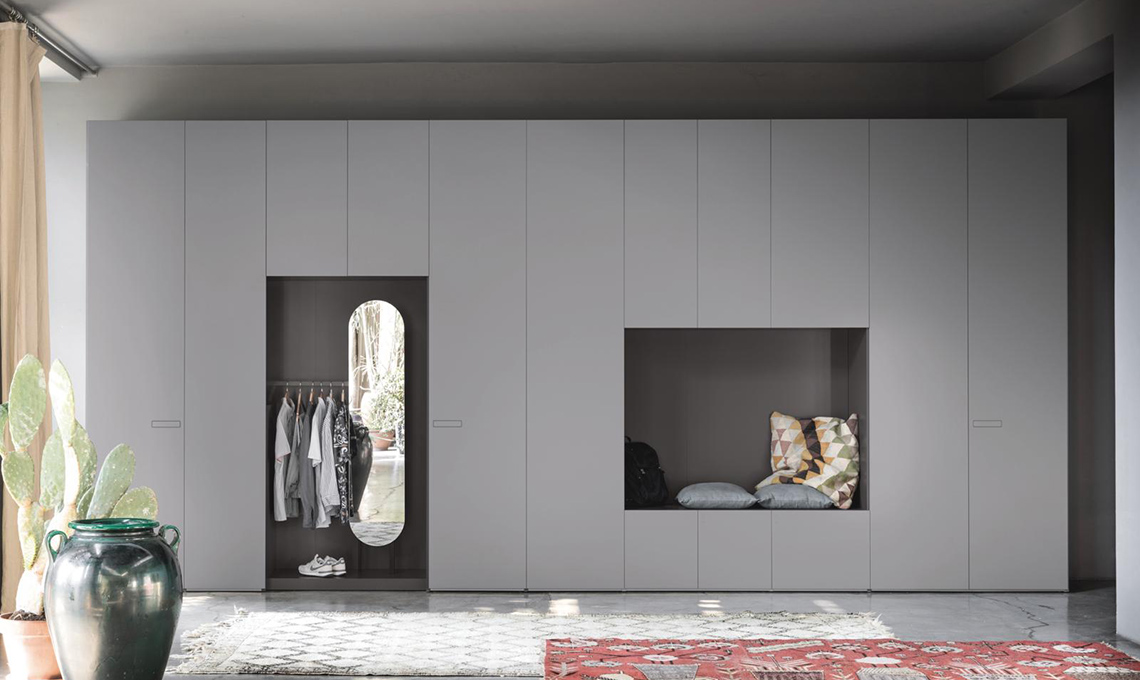 L’armadio ‘effetto parete’ è un volume che garantisce tanto ordine e definisce nuovi spazi. Il modulo a giorno crea una pratica e igienica zona filtro tra dentro e fuori. Oggi, è un must!