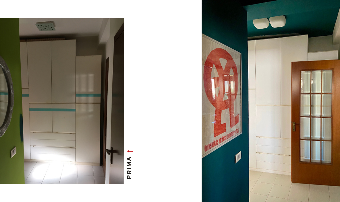 L'armadio nella nicchia, in laminato bianco, portava tutti i segni dei suoi 35 anni: le ante erano macchiate ed ingiallite. Una mano di lavabile di ottima qualità (data a rullo) gli ha restituito lucentezza, oltre a fornire una texture che lo fa confondere con le pareti.
