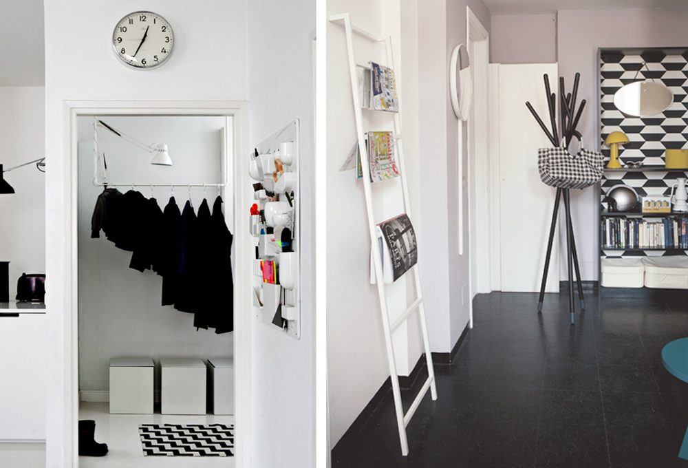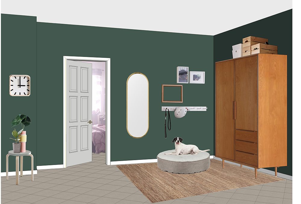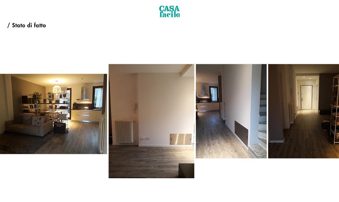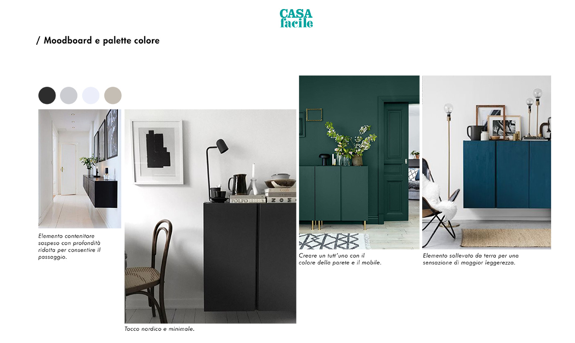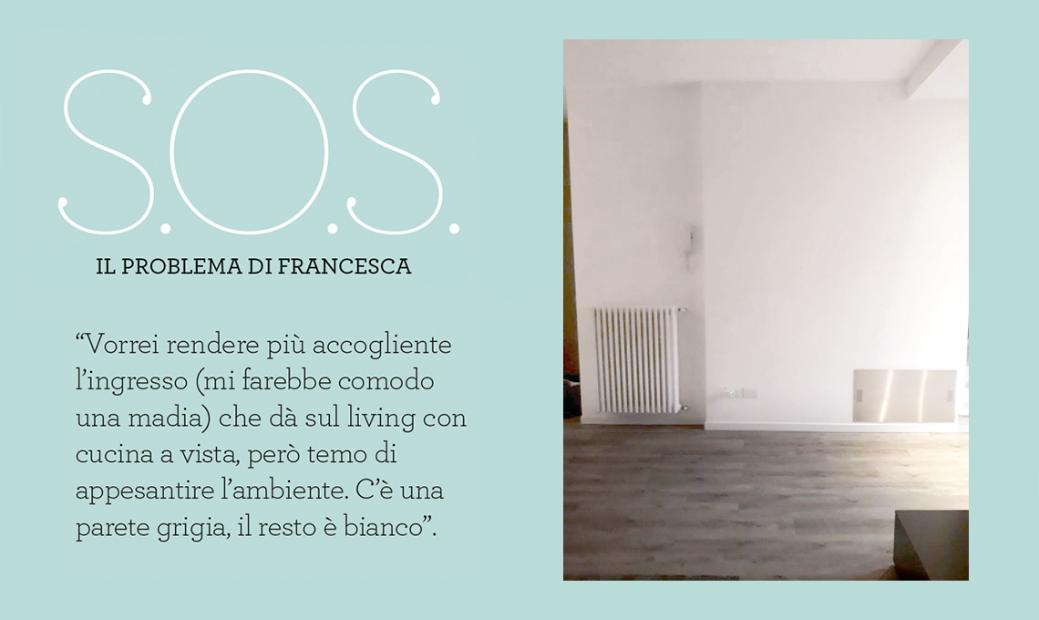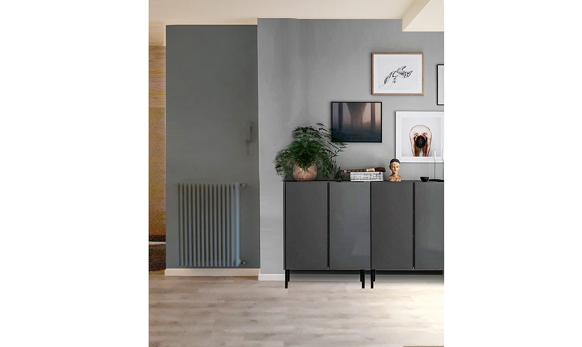 Il consiglio è quello di far proseguire la pittura grigia anche sulle pareti dell’ingresso, creando così una continuità tra i vari spazi. Scegli un mobile sorretto da piedini (oppure sospeso) per dare più leggerezza e lascia libera la parete sopra il termosifone, in modo da creare un giusto equilibrio e indirizzare l’attenzione verso la zona arredata a fianco.